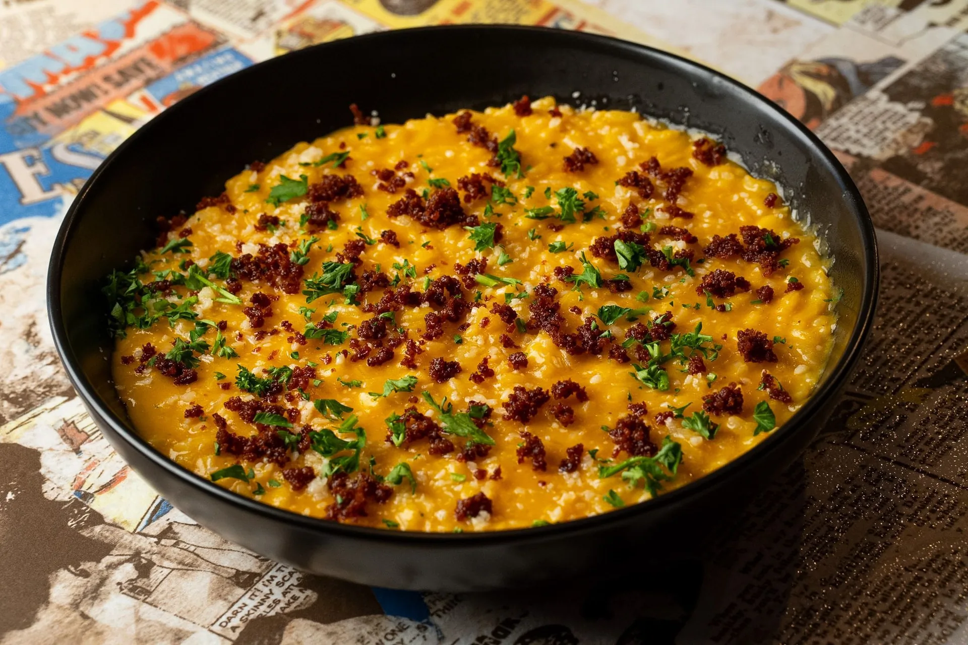 Creamy pumpkin risotto with parmigiano reggiano and pancetta dust