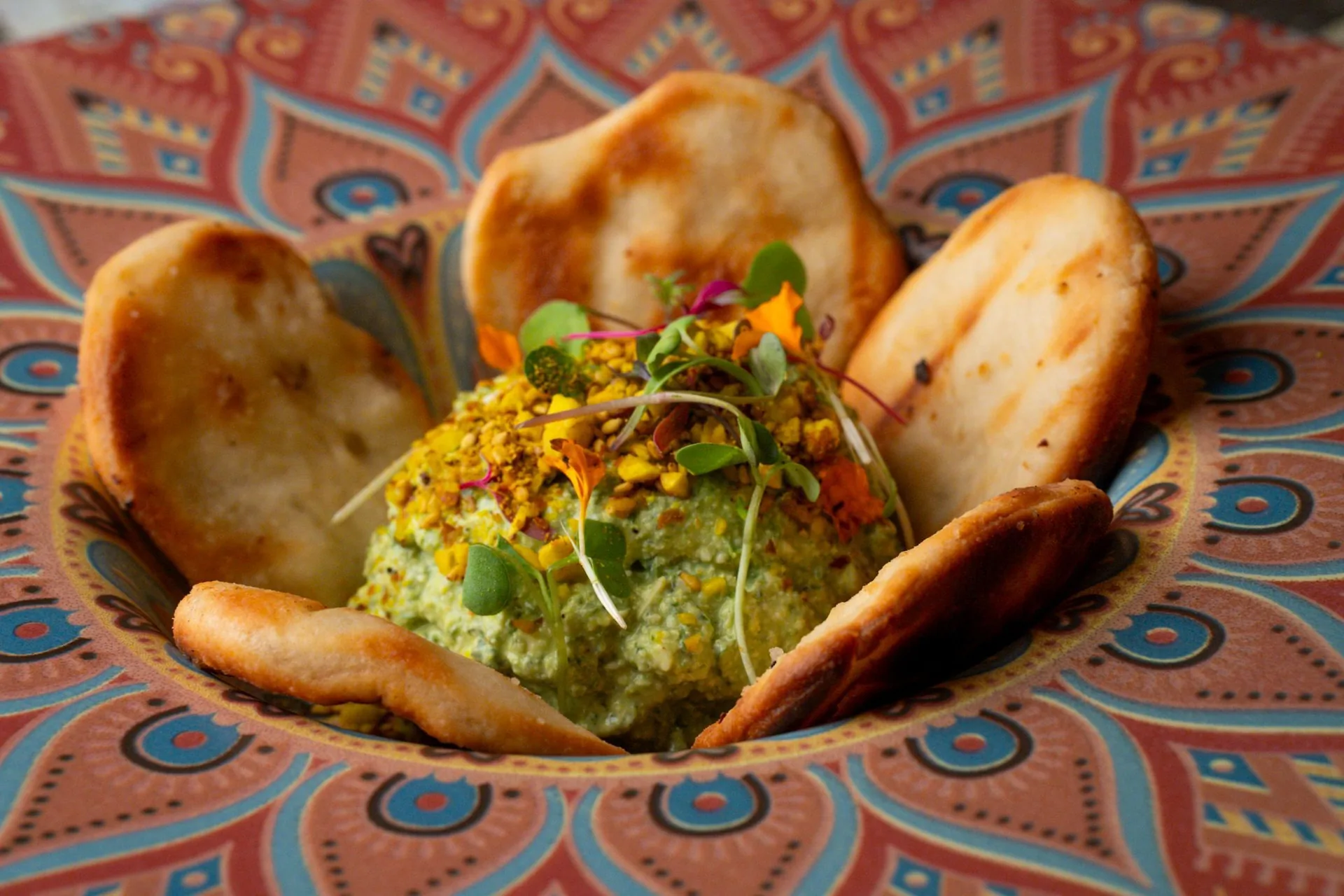 Whipped feta cheese with fresh herbs, avocado and roasted garlic, topped with almonds-sesame seeds served with grilled pita