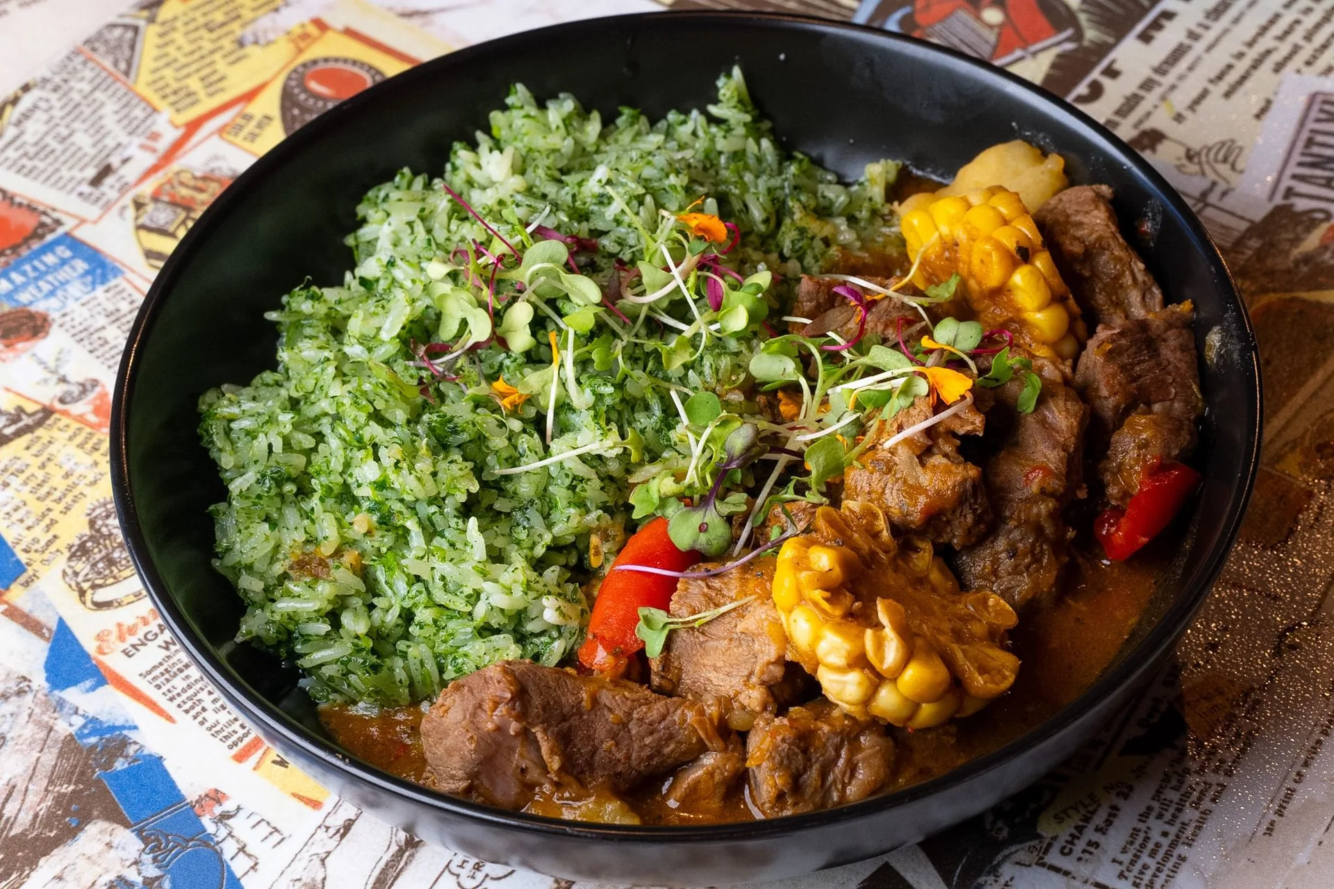 Slow-braised local lamb in a spiced tomato based stew with roasted pumpkin, corn and potatoes served with cilantro rice