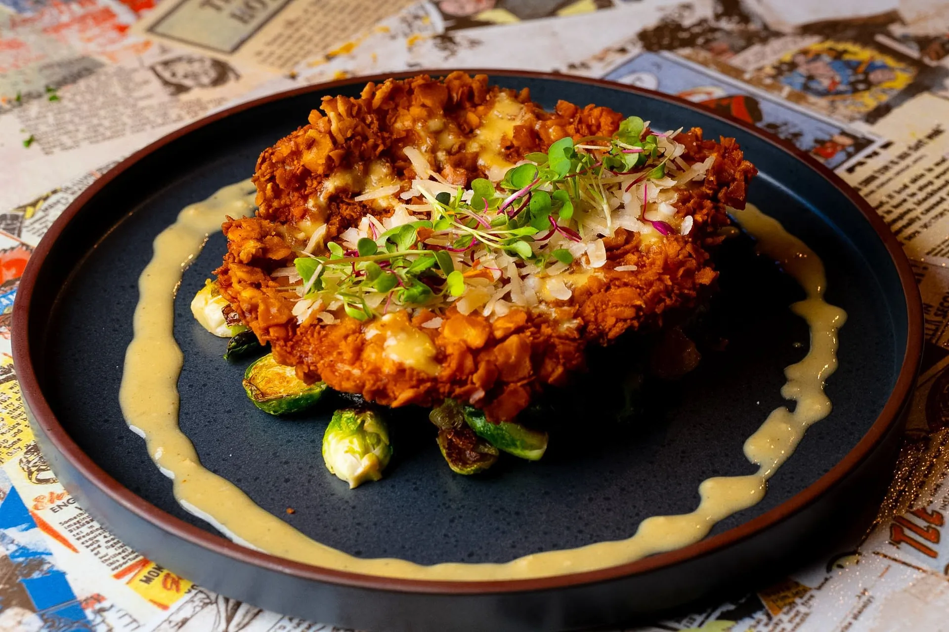 Pretzel-crusted chicken cutlets drizzled with honey mustard vinaigrette, sautéed brussel sprouts and parmigiano reggiano