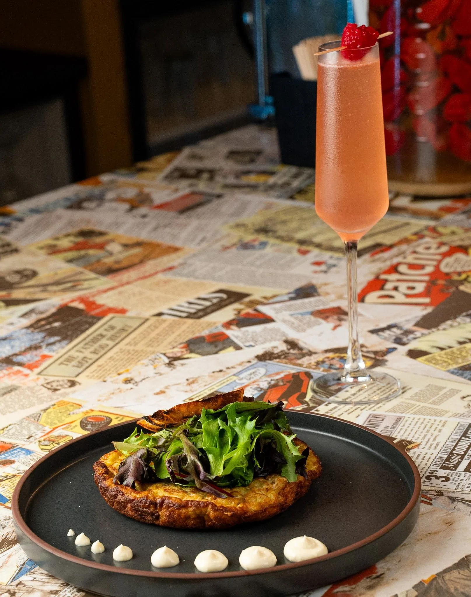 Classic Spanish omelette with potatoes & caramelized onions, served with sourdough toast, mix greens and alioli sauce